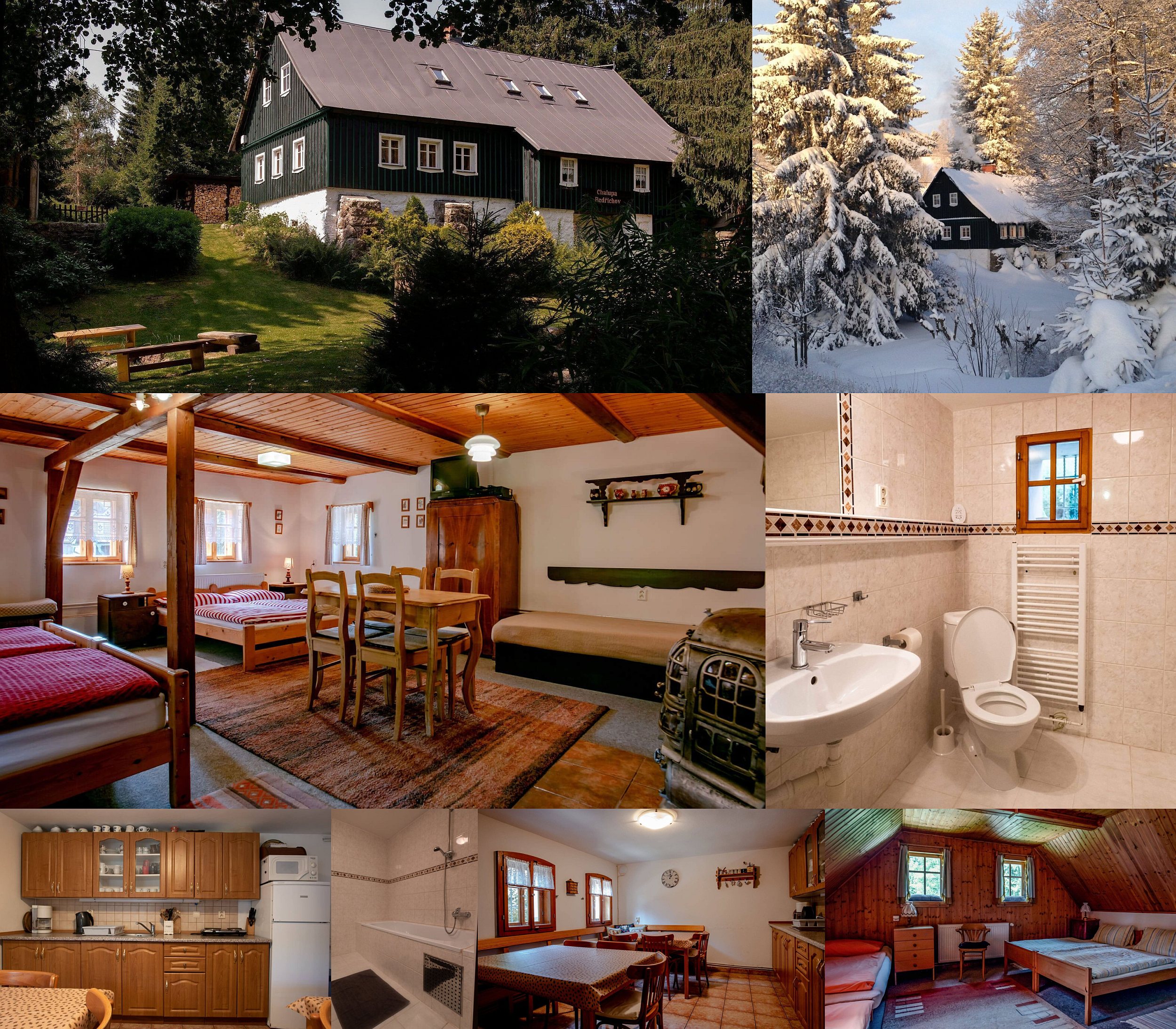 Preis: Léto a mimosezóna: do 10 osob 4.000 Kč/chalupa/noc, každá další osoba 350 Kč/noc (děti 3-10 let 300 Kč/noc, do 3 let 150 Kč/noc). Zima (měsíce 01-03): do 10 osob 4.500 Kč/chalupa/noc, každá další osoba 400 Kč/noc (děti 3-10 let 350 Kč/noc, do 3 let 150 Kč/noc). Při ubytování jen na 1-2 noci +50 Kč/os. Energie, povlečení i parkování jsou v ceně. Připlácí se rekreační poplatek. Pronajímá se vždy celá chalupa – soukromí zaručeno!
