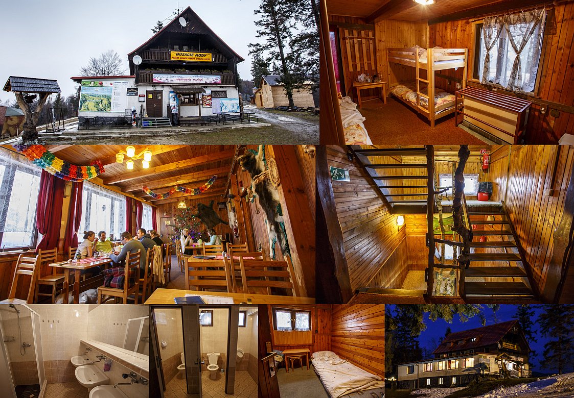 Preis: Leto: penzión 10 EUR/os/noc, zrubová chata 55 EUR/chata/noc. Zima: penzión 12 EUR/os/noc, zrubová chata 80 EUR/chata/noc.