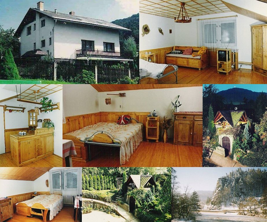 Unterkunft: Vila se dvěma 2-lůžkovými pokoji, 3-lůžkovým pokojem a 6-lůžkovým apartmánem. Všechny pokoje i apartmán mají vlastní soc. zařízení (WC, sprcha), TV a kuchyňský kout (lednička, mikrovlnka, varná konvice, vařič, nádobí, talíře a příbory). Útulnost pokojům dodává originální provedení nábytku a doplňků z přírodního dřeva. U vily je udržovaná zahrada ve svahu s romantickým výhledem na skalní hrad Panteon, s místy k posezení a s otevřeným ohništěm. Součástí zahrady je plně funkční malá kovárna a venkovní krb. Ubytovatel se celý život věnoval tradičním řemeslům, je uměleckým kovářem, pracoval při obnově památek v Praze a na zakázkách pro Národní divadlo. Oblíbil si práci se dřevem. Ukázky z této praxe uvidíte v prostorách ubytování.