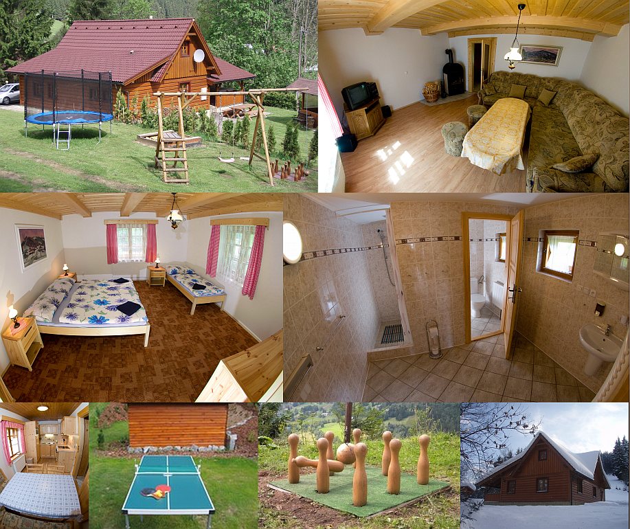 Unterkunft: Chalupa s kapacitou 11 osob. V chalupě jsou 4 ložnice, koupelna se sprchovým koutem, 2 WC, kuchyň (nádobí, rychlovarná deska, mikrovlnka, myčka na nádobí, lednice), jídelna, obývací pokoj (krb, TV, DVD, rádio), terasa s vířivou vanou, elektronické šipky. Venku je gril na dřevěné uhlí, dětské hřiště s pískovištěm, badminton, stolní tenis.