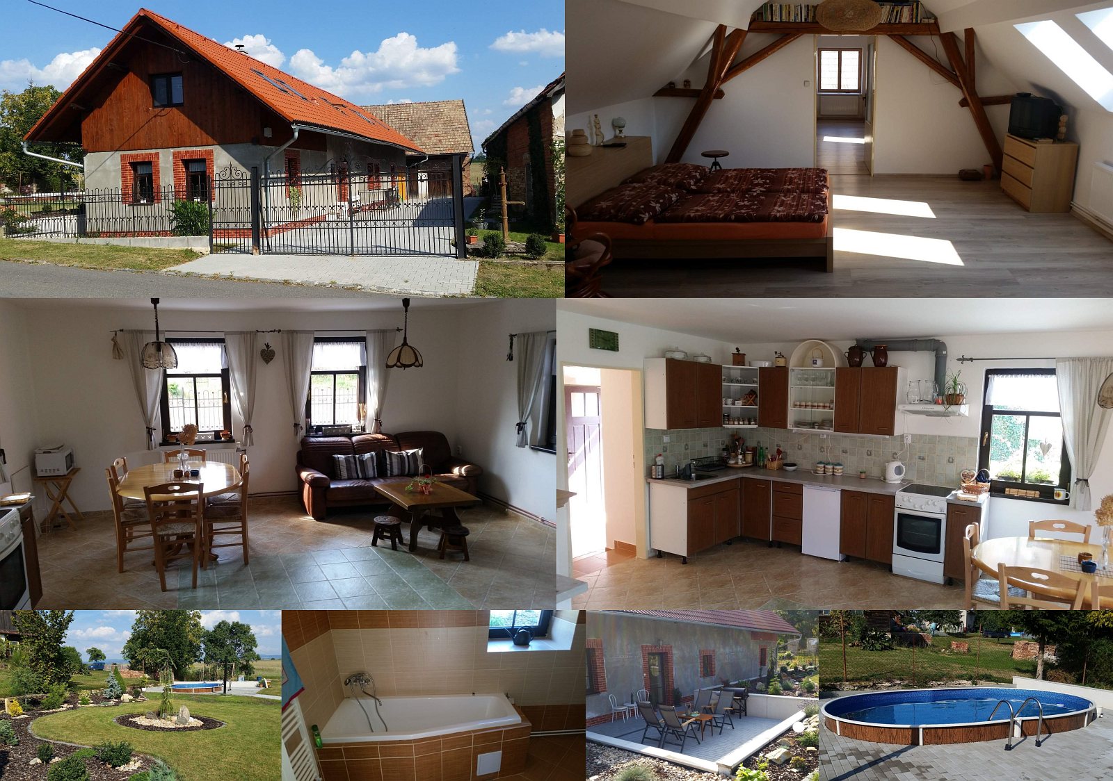 Unterkunft: Rekreační chalupa po kompletní rekonstrukci, max. pro 16-20 osob. V přízemí je obývák s plně vybavenou kuchyní (el. sporák s pečící troubou, mikrovlnka, lednička, varná konvice, jídelní stůl pro 6 osob, sedací souprava, krb s výměníkem a TV), hala se vstupem na terasu, rozkládacím lůžkem a posezením pro 4-6 osob, stará stylová ložnice (2-lůžková) a koupelna s WC. V podkroví jsou tři ložnice (1x2 lůžka + rozkládací gauč, 1x2 lůžka, 1x4 lůžka, možnost dalších 4 přistýlek na matracích). V okrasné zahradě je terasa (se zahradním nábytkem a grilem) a zapuštěný oválný bazén 3,6 x 5,6 m se solární sprchou.