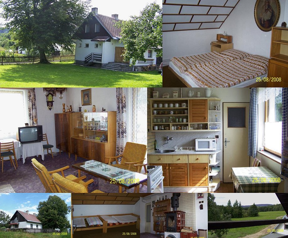 Unterkunft: Zděná patrová chata (chalupa) s velkým oploceným pozemkem, vhodná pro rekreaci rodin s dětmi i s pejsky. Kapacita chaty je 8 osob, po dohodě je možné dodat další přistýlky. Na zahradě je dřevěné posezení s ohništěm, plastové posezení, kotec pro psy velkých plemen. V přízemí chaty je předsíň, koupelna + WC a kuchyň (linka, el. sporák s troubou, varná konvice, mikrovlnka, lednice) spojená s obývacím pokojem (krbová kamna, TV, rozkládací gauč pro 2 osoby). V patře se nachází dvě ložnice (1x2 lůžka, 1x2 lůžka + 2 přistýlky).