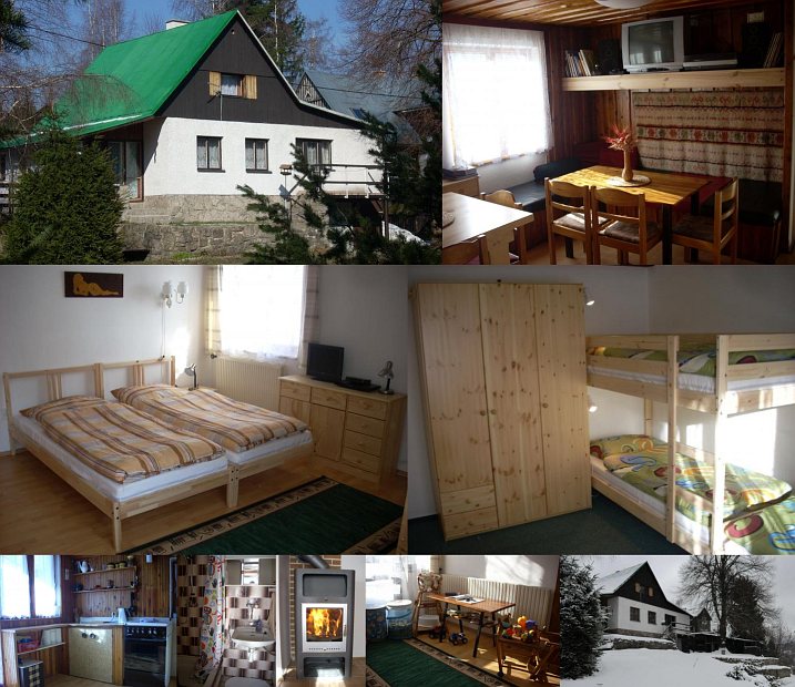 Unterkunft: Chata s kapacitou 16 osob, ideální jak pro rodiny s dětmi, tak partu přátel. Chata má čtyři 4-lůžkové ložnice (dvě v přízemí, dvě v podkroví), společenskou místnost s jídelnou (TV, DVD a CD přehravač, gramofon, dětský koutek s hračkami), kuchyň (mikrovlnka, lednice s mrazákem, topinkovač, sendvičovač, nádobí pro děti), koupelnu (pračka, fén) a WC. Vytápění: krbová kamna s výměníkem, elektrický kotel. Parkování přímo u chaty. V suterénu možnost uschování kol. Před chatou je posezení s ohništěm, udírna, houpačka pro děti. Možnost zapůjčení dětského kočárku. Chata se pronajímá celoročně mimo Silvestr.
