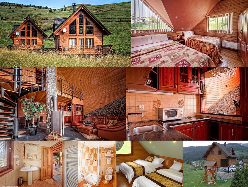 Unterkunft: Dve luxusné novopostavené zrubové chaty, každá s kapacitou 8 osôb. Chaty sú vybavené zabezpečovacím systémom a centrálnym elektrickým vykurovaním. Predsieň s úložným priestorom, kúpeľňa, jedálenský kút, plne vybavená kuchyňa (mikrovlnná rúra, chladnička s mrazničkou, umývačka riadu, varná doska, varná konvica, barový pult, riady), hala, krbová pec pre spríjemnenie zimných večerov, rohová sedacia súprava, LCD TV-SAT, DVD, CD, podkrovie (2x spálňa). Veľká priestranná terasa s výhľadom. Každá chata má 2 parkovacie miesta. Grill. Kvalitné matrace a damaškové posteľné prádlo. Postieľka a vanička pre malé deti.